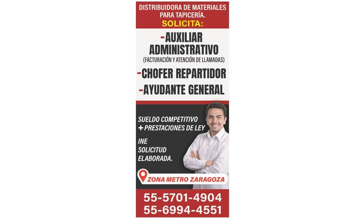 DISTRIBUIDORA DE MATERIALES PARA TAPICERÍA. SOLICITA: -AUXILIAR ADMINISTRATIVO (FACTURACIÓN Y ATENCIÓN DE LLAMADAS) -CHOFER REPARTIDOR -AYUDANTE GENERAL SUELDO COMPETITIVO Y PRESTACIONES DE LEY INE SOLICITUD ELABORADA. ZONA METRO ZARAGOZA 55-5701-4904 5 / AVISO - 000055850701