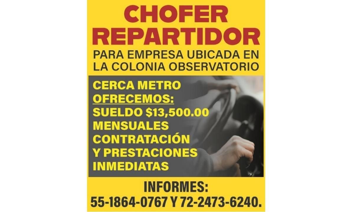 CHOFER REPARTIDOR PARA EMPRESA UBICADA EN LA COLONIA OBSERVATORIO, CERCA METRO. OFRECEMOS SUELDO $13,500.00 MENSUALES, CONTRATACION Y PRESTACIONES INMEDIATAS. INFORMES: 55-1864-0767 Y 72-2473-6240. / AVISO - 000056135401