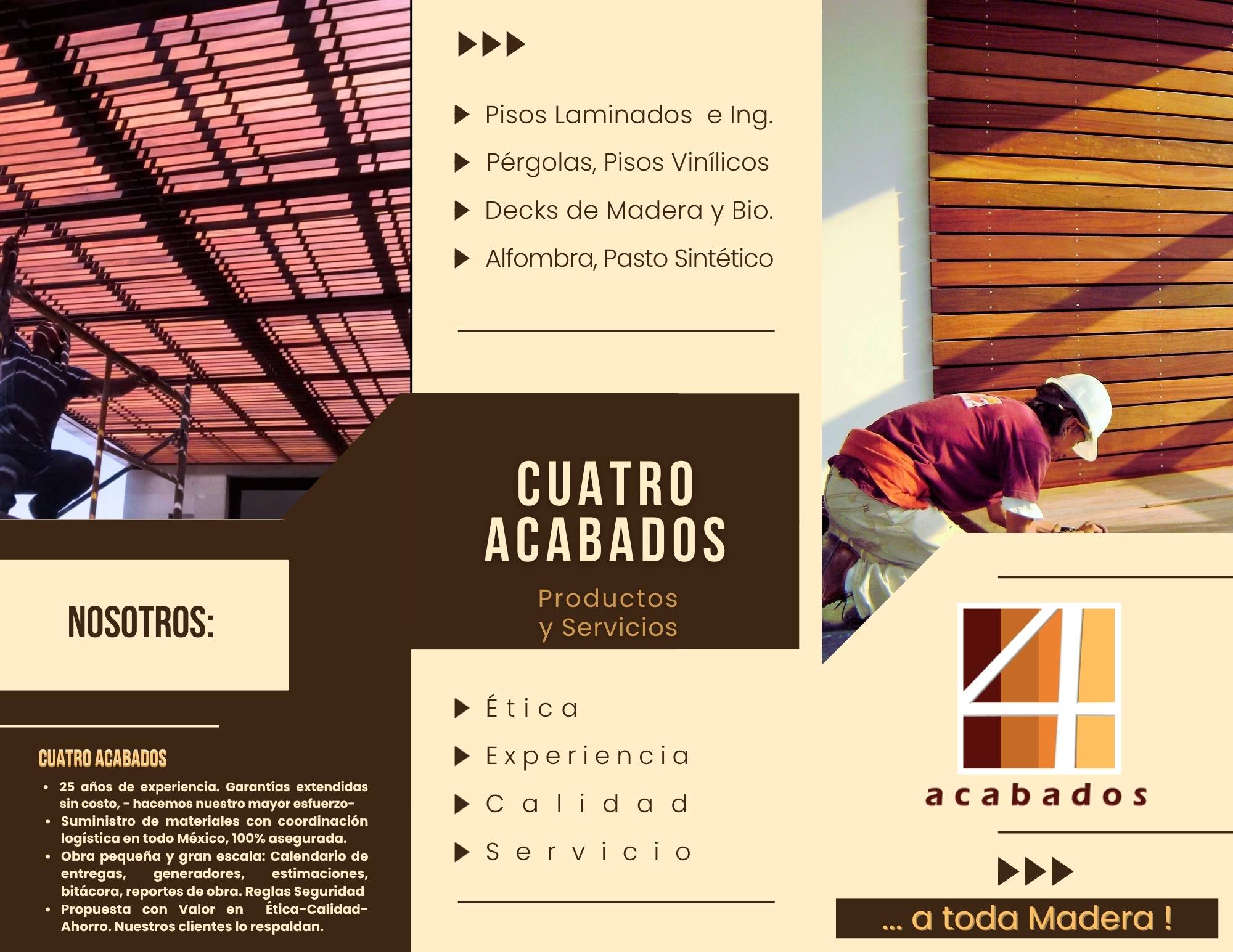 CUATRO ACABADOS (4AKVA2) TE OFRECE LOS SERVICIOS DE: -VENTA, SUMINISTRO E INSTALACIÓN PISOS -SUPERVISIÓN DE OBRA -MANTENIMIENTO -ASESORÍAS GRATIS AL 55 34 15 47 97. PISOS LAMINADOS, INGENIERÍA, DECKS, PÉRGOLAS ARTESANALES, ALFOMBRAS, PASTO SINTÉTICO, PISOS VINÍLICOS, MUROS VERDES, MANO DE OBRA CALIFICADA Y SUPERVISADA POR ARQUITECTOS, -RECUERDA- LA CALIDAD ES GRATIS !. -TENEMOS MÁS DE 30 MARCAS COMO : -TERZA -TEKNO-STEP -DULCE HOGAR -DUCHATEAU -HARD &CO -ETC. AMPLIA EXPERIENCIA, TENEMOS LOS PISOS Y PRECIOS ADECUADOS PARA TI, DESDE SENCILLOS A ALTA CALIDAD. ENTREGA A DOMICILIO EN EL VALLE DE MÉXICO, CON COORDINACIÓN LOGÍSTICA A TODO EL PAÍS. ENTREGAMOS PERSONALMENTE.